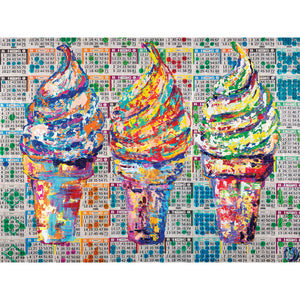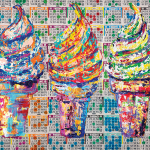 The excitement and nostalgia of Bingo inspired this piece! The colorful dots combine to create a background of inconsistent consistency and a graphic language of pop art. Each dot was put there with the desire and hope to shout out BINGO!