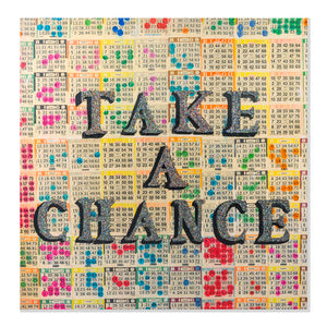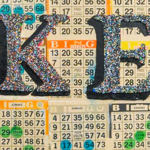 The excitement and nostalgia of Bingo inspired this series. The colorful dots combine to create a background of inconsistent consistency and a graphic language of pop art. Each dot was put there with desire and hope to shout out BINGO!