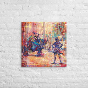 My painting "Fearless Girl" was inspired by Kristen Visbal's Fearless Girl, a four - foot bronze statue of a young girl in juxtaposition to Arturo DiModica's iconic Wall Street Charging Bull in New York City.