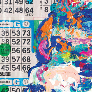 The excitement and nostalgia of Bingo inspired this piece! The colorful dots combine to create a background of inconsistent consistency and a graphic language of pop art. Each dot was put there with the desire and hope to shout out BINGO!