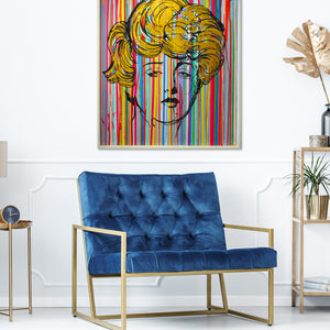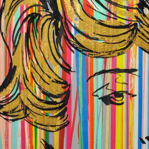 This piece was part of my 2017 Drip series + Gibson Girl series. The background of this piece is from my drip installation Live in Color & the hair is created with gold foil. Get this beauty in the light and she shimmers.