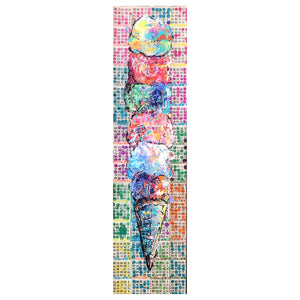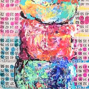 The excitement and nostalgia of Bingo inspired this series. The colorful dots combine to create a background of inconsistent consistency and a graphic language of pop art. Each dot was put there with desire and hope to shout out BINGO!