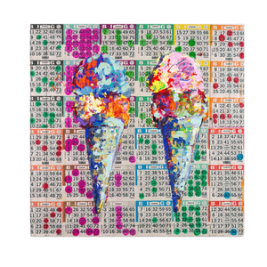 The excitement and nostalgia ofBingoinspired this piece!The colorful dots combine to create a background of inconsistent consistency and a graphic language of pop art.Each dot was put there with the desire and hope to shout out BINGO!