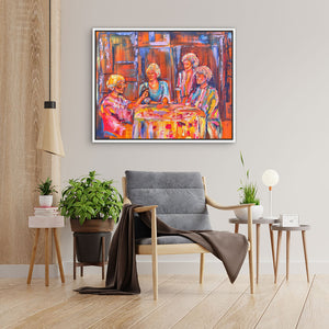 This piece was produced on loose canvas and currently is not stretched. Cost includes stretching & hanging hardware but not framing. We can provide assistance with framing for an additional fee that can be provided based on your framing preferences.