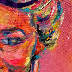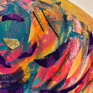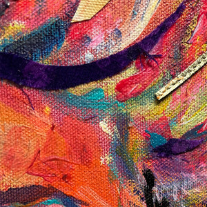 A mixture of materials were used to create heavily textured + layered canvases. They are intended to evoke feelings, thoughts and themes about friendship, loyalty, truth, LOVE + humor.