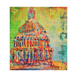 This piece was made in 2018. I made a series of bright and bold mini Pop Capitols. This piece shows the intensity and grit of DC. I love the teals and neon greens throughout this piece.