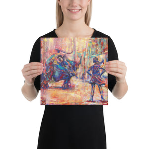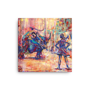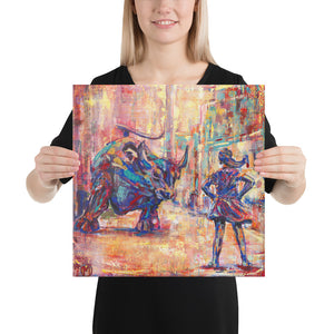My painting "Fearless Girl" was inspired by Kristen Visbal's Fearless Girl, a four - foot bronze statue of a young girl in juxtaposition to Arturo DiModica's iconic Wall Street Charging Bull in New York City.