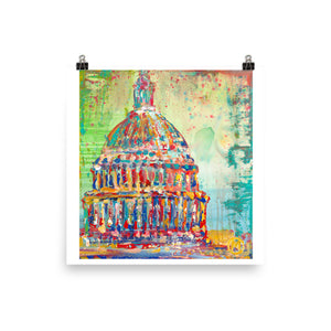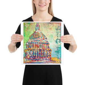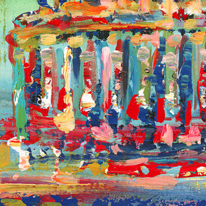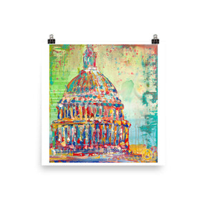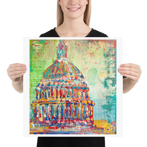 This piece was made in 2018. I made a series of bright and bold mini Pop Capitols. This piece shows the intensity and grit of DC. I love the teals and neon greens throughout this piece.