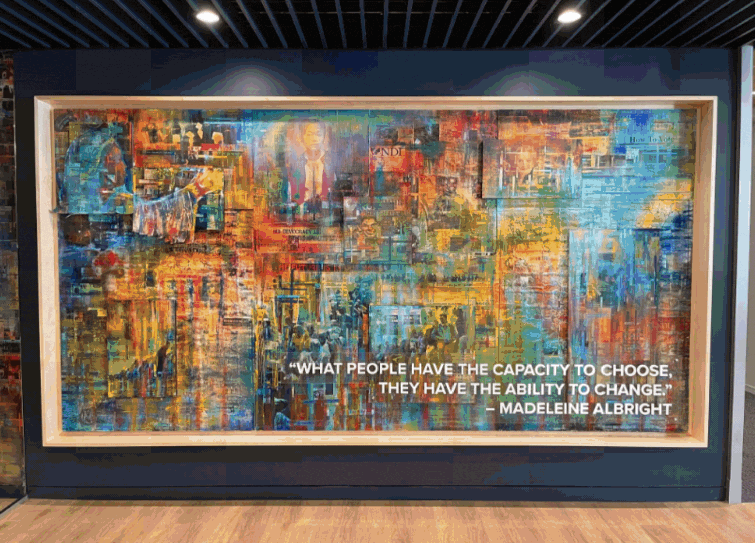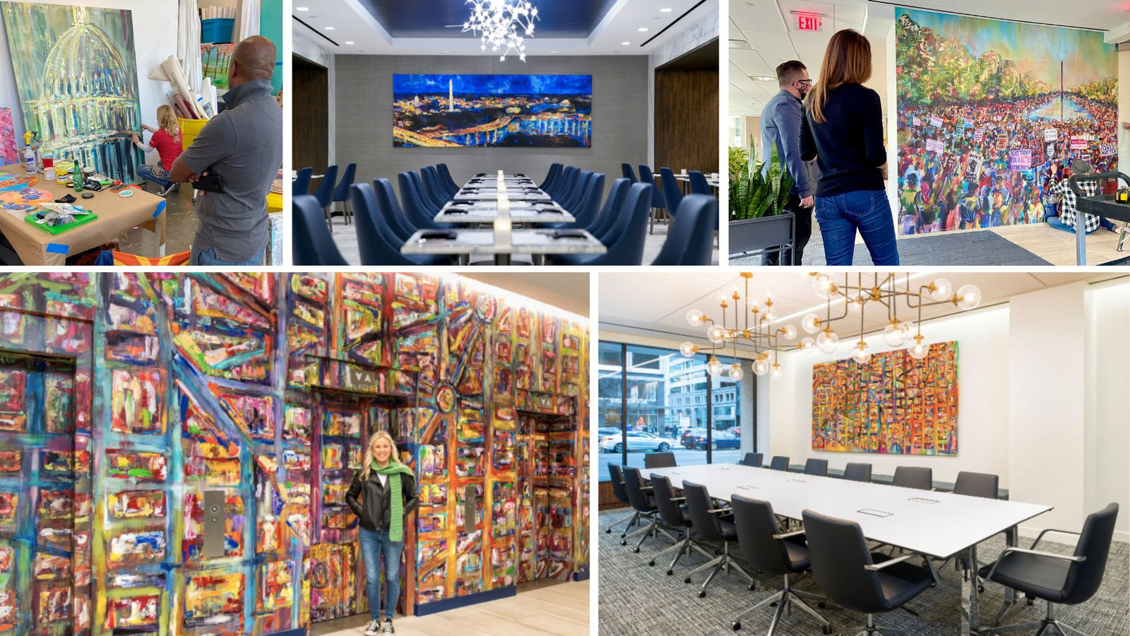 I was commissioned by JLL in 2019 to create a collection of unique commissions for their new office located at 2020 K St NW in DC. I used a mixture of limited edition giclee prints, photographic wall coverings, and mixed media commissions inspired by the building and developer plans to bring some energy and color into their space.