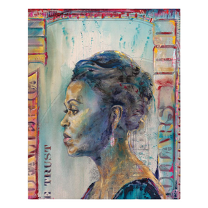 This portrait of Michelle Obama was painted to be a part of the Social Currency collection and completed shortly before the 2016 election. Using the graphic composition of the 100 dollar bill, turned vertically, the profile portrait was intended to reference a postage stamp. It was purposeful for Michelle to look like a queen.